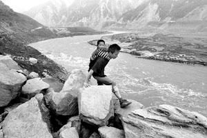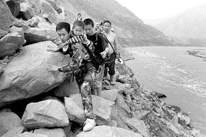 走了大半天,前方的路被新落下的大石擋住,如果要過(guò)去,記者必須雙手扒著石頭,側(cè)身挪過(guò)。但這樣,孩子便會(huì)被置于半空,萬(wàn)一孩子手一松,瞬間就會(huì)跌入大江。