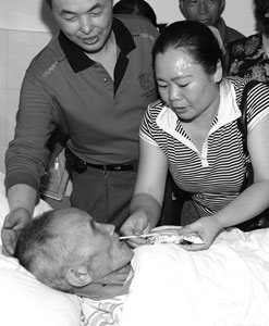 “我8歲時(shí)父母便相繼過(guò)世了,是爺爺把我拉扯大的!弊蛱煜挛纾谑惺嗣襻t(yī)院95歲老人張開(kāi)富的病床旁,59歲的孫子張貴清老淚縱橫地說(shuō),5月12日中午,他正在地里干農(nóng)活,突然地動(dòng)山搖,田地竟裂開(kāi)了口子。張頓時(shí)明白發(fā)生地震了,來(lái)不及多想便光腳往1公里外的家跑去,因?yàn)榧依镞有臥病在床的95歲爺爺張開(kāi)富。眼見(jiàn)道路兩邊的農(nóng)舍相繼倒下,張僅用了四五分鐘便跑回了家,只見(jiàn)3層小樓的二三層已坍塌。張沖進(jìn)一樓臥室,發(fā)現(xiàn)爺爺已被震倒在地,大半個(gè)身子被磚石掩埋。由于怕廢墟再度垮塌,張貴清只得徒手刨開(kāi)磚石,然后背上爺爺沖出了搖搖欲墜的家,并將爺爺安頓在空地上。