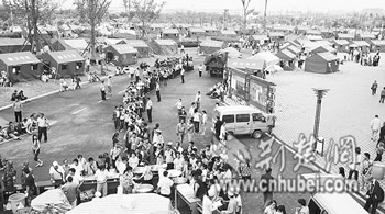 遠(yuǎn)遠(yuǎn)望去,上千頂帳篷密密地排在體育館四周的草坪和廣場上,體育館主場館外墻上,幾條橫幅醒目地掛著——“相互幫助相互關(guān)心,同船共濟(jì)共渡難關(guān)”、“黨和政府永遠(yuǎn)和人民心連心”。擴(kuò)音器里,除了播放尋親的啟事,就是反復(fù)地低唱著“讓世界充滿愛”的歌曲:“輕輕地捧起你的臉,為你把眼淚擦干……”