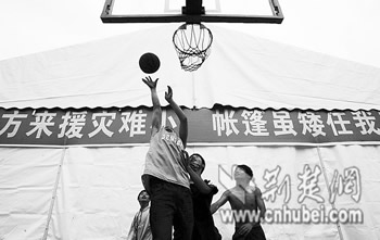 籃球場還有一個籃球架和五分之一個場地空著。傍晚7時,14歲的北川縣漩坪中學(xué)初一學(xué)生張俊林,和幾個伙伴一起打起籃球。他說,他的家毀了,但沒有人受傷,他現(xiàn)在一家5個人與其他三家人一起住在一個大帳篷里,他現(xiàn)在最盼望的是快點回到真正的教室上課。(特派記者 韋忠南 張泉 陳世昌)