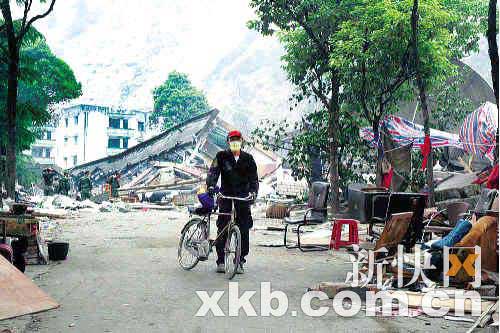劉相宇第二次進映秀時撿了一輛自行車查看災情。