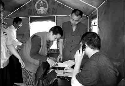 昨天,在什邡市區(qū),開(kāi)業(yè)的商店在增多,交通運(yùn)輸在恢復(fù),政府機(jī)關(guān)在堅(jiān)持上班,受災(zāi)群眾在一步步得到安置,工作生活秩序正在走向正常。維持和捍衛(wèi)著秩序的法院,在受災(zāi)群眾中間,用帳篷搭建起第一座災(zāi)后臨時(shí)審判庭。