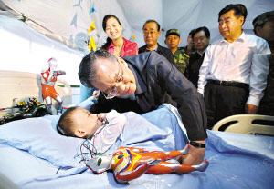 5月23日,溫家寶總理專程到綿陽404醫(yī)院監(jiān)護室看望了3歲的小郎錚,稱贊他“堅強、勇敢”。