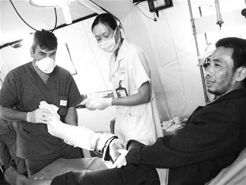 昨日上午10點(diǎn)半,設(shè)在綿竹孝德鎮(zhèn)的意大利醫(yī)療野戰(zhàn)醫(yī)院手術(shù)室里抬進(jìn)了一名在地震中骨折的傷者。汗水從骨科醫(yī)生朱力亞諾·羅迪尼的額頭上滲出來,他一邊比劃著詢問傷者的情況,一邊用藥物清洗已經(jīng)感染的部位。此刻,對朱力亞諾·羅迪尼這樣的國際志愿者來說,他只知道自己是醫(yī)生,他要醫(yī)治好更多的傷者。