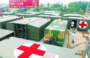 在綿竹市市政府旁邊的2萬平方米的大塊空地上,一個個深綠色的“鐵皮大家伙”敦實地坐落在上。周圍的人告訴記者:“我們看病就鉆進那個鐵家伙里面,不怕風也不怕雨的,很好!”
