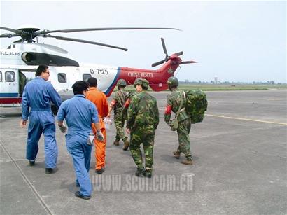 5月21日清晨,廣漢機(jī)場(chǎng)緊張有序地展開(kāi)營(yíng)救8名被困工人的行動(dòng),多架飛機(jī)飛向綿竹清平大山偵察?战当硯熍沙鲂》株(duì),背著繩索、攜帶衛(wèi)星定位系統(tǒng)進(jìn)行救援。