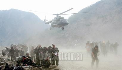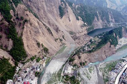 昨日上午9時,記者登上運(yùn)送搶險物資的直升機(jī),飛機(jī)穿過北川縣城南端的險要溝壑后,緩緩飛入四處塌方、滑坡的唐家山山谷。透過飛機(jī)的舷窗,遠(yuǎn)遠(yuǎn)地可以看見前下方狹長河堤上有一個巨型堤壩,堤壩上面的凸出部位依稀可見隨風(fēng)飄揚(yáng)的紅旗!斑@是搶險部隊插的,你看上面都有他們的部隊名稱呢!彪S機(jī)護(hù)送物資的戰(zhàn)士解釋說。
