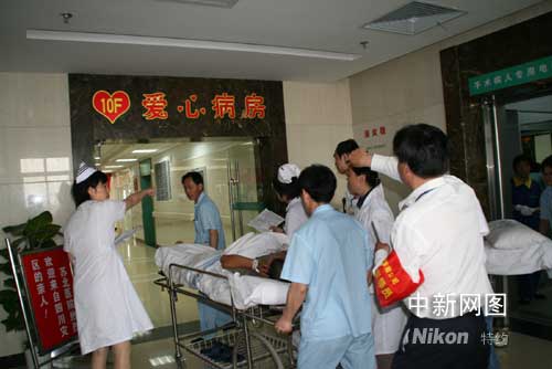 記者坐上載著傷員救護(hù)車,警車開(kāi)道一路綠燈直達(dá)救治的醫(yī)院,在車上傷員家屬告訴記者:到處都是我們的親人,一路上大家都很受照顧,已經(jīng)感受到家庭的溫暖。下午四時(shí)許,駛進(jìn)蘇北醫(yī)院,為了迎接傷員,醫(yī)院早就開(kāi)始了準(zhǔn)備,在住院十病區(qū)開(kāi)辟了 “愛(ài)心病區(qū)”。王靜成院長(zhǎng)稱,這是我們醫(yī)院最好的病房,醫(yī)院為四十名災(zāi)區(qū)傷員親人配備了經(jīng)驗(yàn)豐富的醫(yī)護(hù)人員,確保醫(yī)療安全,盡量降低致殘率,讓他們安心治病、早日康復(fù)。