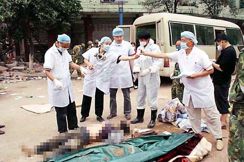 到了鎮(zhèn)中心,漢旺鎮(zhèn)政府的牌子依然掛在尚未倒下的門柱上,但里面的建筑全部倒伏,據(jù)說還有幾十人埋在里面。再前行百余米,估計是以前最繁華的鎮(zhèn)中心,帶隊者停了下來,向我們作了詳細(xì)的要求:對于兩邊挖出來的尸體,家屬能辨認(rèn)的,只作登記,不作尸檢;沒有家屬辨認(rèn)的,需要記錄其身高、胖瘦、體表標(biāo)志,然后切取一段2至3厘米的肋軟骨用95%的乙醇固定,以備將來與死難者親屬對照,確認(rèn)其身份。視聽技術(shù)人員則同時對死者進(jìn)行拍照,按步驟對應(yīng)每一個標(biāo)本編號存檔。作為法醫(yī),我們對于這些要求一聽就明白,于是我們一行人分成兩個組展開工作。