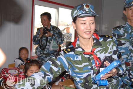 海軍少將宋祖英和海軍文工團(tuán)的藝術(shù)家們在天河海軍小學(xué)成立當(dāng)天也來到了學(xué)校,看望了學(xué)校里的孩子們。宋祖英為孩子們帶來了學(xué)習(xí)用品和玩具,并鼓勵孩子們努力學(xué)習(xí),長大以后為家鄉(xiāng)建設(shè)做貢獻(xiàn)。(記者 劉俠 黃國苗 曹獻(xiàn)龍)