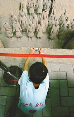 所以被嘆為“同埃及金字塔媲美的世界人類文化寶貴財(cái)富”的兵馬俑,一直受國(guó)外游客格外青睞。但在今天的游客里,偶爾才發(fā)現(xiàn)幾個(gè)金發(fā)游客。直到中午12時(shí),才見到一個(gè)中東國(guó)家的旅游團(tuán)。