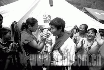 “親一個,親一個!”在滔滔的岷江邊,在凌亂的廢墟旁,在簡單的帳篷里,這樣的聲音對遭遇特大地震災(zāi)害后的汶川而言,顯得久違而珍貴。正是在這個重災(zāi)區(qū),在鄉(xiāng)親們熱情的呼喊中,昨日上午,汶川縣威州鎮(zhèn)雙河村的一對年輕羌族戀人攜手走進(jìn)婚姻殿堂,為這個劫后重生的地方增添了一些喜氣。