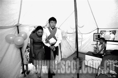 沒有床怎么辦?幾個年輕人跟隨王小波來到廢墟中,費了很大勁,硬是從中把新床、新被單、毯子和被子給掏了出來。不過,王小波感到有些遺憾,因為沒有把結(jié)婚證找到。“還不錯,靠大家?guī)兔ΓF(xiàn)在啥子都整好了!弊蛉丈衔缯脚e行婚禮前,王小波帶著記者進(jìn)入到帳篷“洞房”中。在這個白色素雅的帳篷里,一架嶄新的床擺放在中央,上面鋪著嶄新的毯子、被子。一些好心的鄉(xiāng)親還專門給這對新人找來一些紅布,懸掛在帳篷頂上,為這個簡單的“洞房”增添了喜慶氣氛。