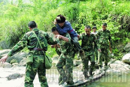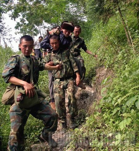 一大早,我們160人每人背著40公斤給養(yǎng)、物資、器材開始翻越這座大山。政委說,茶坪老百姓需要我們。在翻越一個峭壁時,列兵侯軍腳下一滑摔倒了,旁邊就懸崖,慶幸的是,除背囊隨著山石滾下山崖,侯軍本人安全地爬了起來。九個小時后,我們終于到達茶坪鄉(xiāng)。茶坪鄉(xiāng)副鄉(xiāng)長張平一見到我們,就撲通一聲跪在了參謀長面前說:“人民子弟兵來了,茶坪就有希望了……”參謀長一把將他扶起,兩個漢子都淚流滿面。