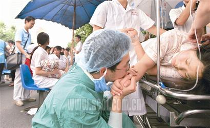 市民們和醫(yī)生心手相連的場面打動了每一位路人,也刺激著我的快門不停響動。透過人群中的縫隙,一幕畫面深深地打動了我的心靈,只見一位身穿手術(shù)服,頭戴消毒帽的年輕男子正蹲在一臺擔(dān)架車旁,握著一位虛弱的產(chǎn)婦的手,無言地對視著,他們正等待著小生命的降臨。突然,男子將她的手放在唇邊,輕輕一吻,就像在說:老婆,你不要怕,一定不會有事,我們的孩子會平安降生。按動快門的同時,淚水滑過我的眼眶。