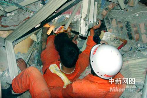 這里還有生命存在!濰坊市公安消防支隊(duì)參加救援的官兵迅速聚集在這片廢墟周圍,小心翼翼的搜尋生命奇跡的存在地。這是映秀灣發(fā)電廠的賓館,6層樓建筑已經(jīng)全部垮塌,電廠賓館廢墟堆高約4米,樓板磚墻層層疊壓,上部樓板隨時(shí)都有再次坍塌的可能。距現(xiàn)場2米的右側(cè),是一座6層高且遙遙欲墜的未倒塌建筑,余震之中樓體搖搖晃晃,不斷有磚石碎塊掉落,整幢建筑岌岌可危。