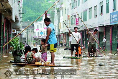 內(nèi)澇淹城鎮(zhèn),居民進(jìn)出很不方便。凌云縣有關(guān)部門調(diào)派了卡車和沖鋒舟,供沿線居民進(jìn)出。記者看到,許多進(jìn)城鎮(zhèn)小車被擋在外面,兩輛卡車由于涉水能力強(qiáng),負(fù)責(zé)運(yùn)送過(guò)往的村民和物資。有的市民自制竹伐或涉水工具,渡“河”出行,有的居民還牽出馬來(lái),騎馬過(guò)“河”。