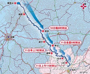 唐家山堰塞湖下瀉的洪水正向重慶奔來,預(yù)計(jì)今日凌晨5時進(jìn)入(重慶)潼南米心鎮(zhèn),今上午11時到達(dá)北碚。