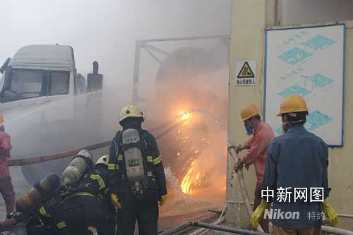 黃磷,自燃點(diǎn)在34至60攝氏度,在空氣中能自燃,屬一級(jí)危險(xiǎn)化學(xué)品。上午11時(shí)許,雖然火勢已被完全控制,但黃磷仍在不斷的泄漏著。槽罐車被4支噴霧水槍包圍著滅火冷卻,地面上的水越積越多,漏出罐體的黃磷在水中也不在燃燒,但黃磷隨著滅火用水向四周擴(kuò)散,如果不能及時(shí)回收這些黃磷,停止供水之后,這些黃磷將自燃引發(fā)新的次生事故。該公司為了防止泄漏的黃磷進(jìn)一步擴(kuò)散,及時(shí)封堵了通往公司外的排水口,而且還調(diào)集了十輛沙土,隨時(shí)圍堵可能溢出的滅火用水。