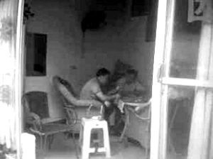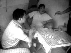 網(wǎng)友“善良老百姓”還在論壇里貼出兩張抓拍的照片:兩名穿藍色T恤的男子,拿著撲克坐在桌前,桌上散亂地鋪著現(xiàn)金;第三人的面目沒出現(xiàn)在畫面里,但可以見到其伸出的一只手。從照片的畫面判斷,拍攝者當(dāng)時站在房間外。