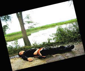 “砰!砰!”,隨著兩聲槍響,其中一個(gè)持槍的“3號”劫匪胡×妙被擊中頭部,立刻倒在水中,被擊傷的張×名和龍×富則爬上田基,分別向北和西方向逃跑。