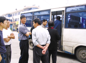 通知發(fā)出的第3天,進入茅山集鎮(zhèn)的路口突然出現(xiàn)手持警棍的12名執(zhí)法隊員,他們一字排開,將路口封死,嚇得客車連忙下客,將乘客丟在雨中,匆匆回頭。第4天,司機們索性將車停在離集鎮(zhèn)入口100米的“高璟超市“門前,但執(zhí)法隊仍然進行驅趕,無奈客車只好再退3.5公里,停在茶場一隊。見車主還是不交“保證金”,執(zhí)法隊繼續(xù)干預,將客車又逼退1.5公里左右,停在茶場二隊。此地已經(jīng)距離茅山6公里左右,到了后白鎮(zhèn)境內。但心有余悸的司機還是不放心,又向后退出1公里,索性停在茅西小鎮(zhèn)上。