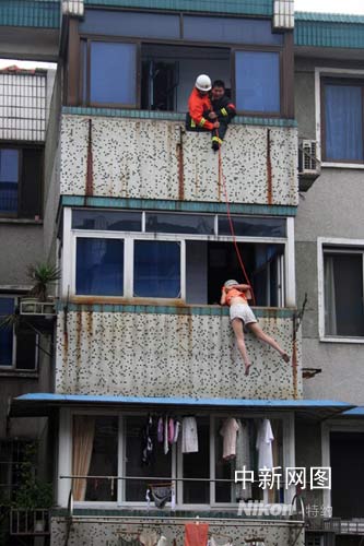 中新網(wǎng)紹興6月26日電(記者 柴燕菲 通訊員 余昌龍、胡甸)一個(gè)身穿黑色緊身背心的男子倒掛在離地約20米高的六樓陽(yáng)臺(tái)上,一招“壁虎游墻”雙手慢慢攀爬向五樓陽(yáng)臺(tái)上坐著的女子,幾乎就是一眨眼工夫,黑色身影“飛鷹撲兔”一把擒住五樓欲輕生女子,四周響起一片喝彩與叫好聲……