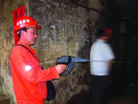 救援人員拿著生命探測(cè)儀進(jìn)入坑口