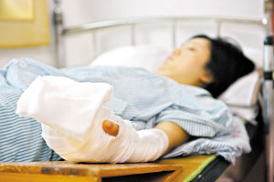 3名年輕女子在一家俱樂部唱完歌后遭一男子騷擾,在隨后的沖突中這名男子竟咬下其中一名女子的一截手指頭,另兩名女子也不同程度地受傷。昨日(29日)下午,記者在廣州和平手外科醫(yī)院見到了躺在病床上的劉女士。已接受再植手術的劉女士左手纏著厚厚的紗布,小指最上面一截已經明顯發(fā)黑。