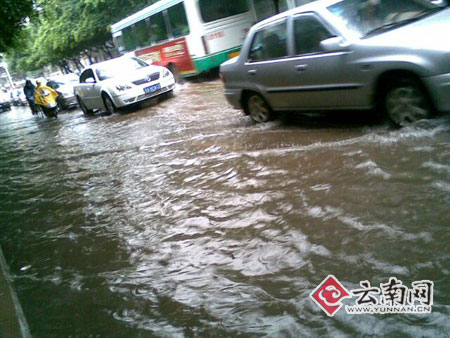 7月1日晚至今天的昆明持續(xù)暴雨,大雨再次挑戰(zhàn)昆明排水系統(tǒng),全城不同程度遭水淹,最深處已超過1米。很多早起上班上學(xué)的市民只能涉水“過河”,而車輛只能在水中“游泳”。今日凌晨,本網(wǎng)手機(jī)報(bào)彩信平臺陸續(xù)收到了熱心市民拍攝的現(xiàn)場圖片近百張。此次大雨淹城,距上次昆明因強(qiáng)降雨造成水患僅隔半個(gè)月時(shí)間。據(jù)省氣象臺預(yù)報(bào),未來48小時(shí)昆明還降普降小雨到大雨,積水在短時(shí)間內(nèi)還將持續(xù),請市民提前做好出行安排。