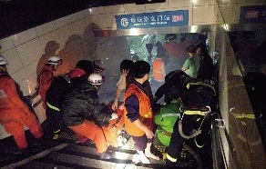 晚9點(diǎn)50分,記者乘坐地鐵2號線到達(dá)崇文門站時,站內(nèi)廣播通知稱,因天氣原因,2號線與5號線在崇文門站無法換乘。在2號線站臺進(jìn)入5號線換乘的入口處,有數(shù)十名旅客滯留。一名乘警向乘客解釋說,5號線太平橋南段至天通苑北區(qū)間正常運(yùn)行,但和平西橋站以南停運(yùn)。隨后,記者出站到達(dá)地面,發(fā)現(xiàn)地鐵5號線崇文門站的各個入口均已被封閉,大量旅客冒雨等候。在該站南側(cè)兩個入口處,多輛工程搶險車正在待命。隨后,多輛消防車趕到現(xiàn)場,架起數(shù)條水龍帶,從站臺內(nèi)往外抽水。