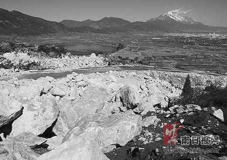 站在麗江城區(qū)的高樓之上,向玉龍新城區(qū)與文筆海遠眺,首先看到的便是文筆山青山綠水間面山的傷痛。遠看似乎是一個采石場,走近才看清是一條盤旋的道路。