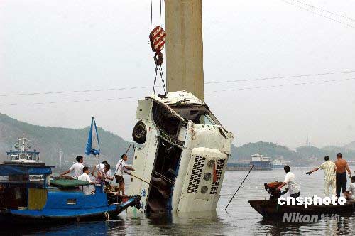 2008年7月12日,湖北宜昌市發(fā)生車輛撞破橋梁護(hù)欄墜河事故,目前已造成5人死亡,4名失蹤者正在尋找中。中新社發(fā) 方佩 攝