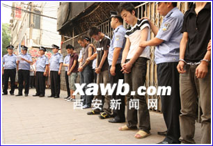 打架吃了虧,就糾集朋友,幫自己報(bào)仇;在報(bào)仇不成的情況下,又將一家網(wǎng)吧燒毀,給網(wǎng)吧造成了50余萬(wàn)元的經(jīng)濟(jì)損失。案發(fā)后,碑林警方迅速出擊,將涉案的5名主要嫌疑人抓獲。昨日下午,警方在案發(fā)現(xiàn)場(chǎng),對(duì)幾名犯罪嫌疑人進(jìn)行了公開(kāi)處理,得到了周?chē)罕姷暮迷u(píng)。