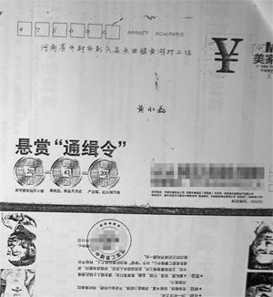 進(jìn)門后,黃明華看到二老呆坐著,手里拿著“通緝令”。他打開(kāi)信封,里面其實(shí)是鄭州一家房地產(chǎn)公司的廣告。上面寫著“懸賞通緝”,左右兩側(cè)分別有3個(gè)人頭素描,“很像通緝犯”。