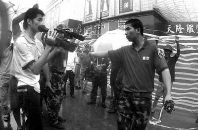 10時(shí)15分,來(lái)了20余名穿紅上衣、衣服上標(biāo)有“大同路人防工程”字樣的年輕男子,阻撓記者采訪。拿手機(jī)拍照的群眾也遭到威脅。河南日?qǐng)?bào)記者在拍照時(shí),六七名紅衣男子上前,揪住記者上衣領(lǐng)口,反扭其雙手,往機(jī)動(dòng)車(chē)道上推搡,記者的上衣被撕爛。市民紛紛指責(zé)這些紅衣男子,不去救人,反而扭打記者。