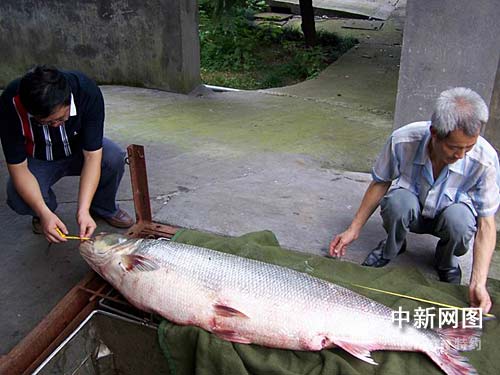 中新網(wǎng)杭州7月20日電(記者龔讀法 通訊員龔一磊) 日前,浙江省杭州千島湖發(fā)展有限公司捕撈隊在千島湖宅上攔網(wǎng)上捕獲特大鱤鰍魚一條.該魚長165cm,胸圍91cm,重54公斤,是近年來捕獲的最大鱤鰍魚,同時也是今年以來千島湖內(nèi)捕獲的第三條超百斤的大魚。目前,該鱤鰍魚已送上海水產(chǎn)大學(xué)制作標本。