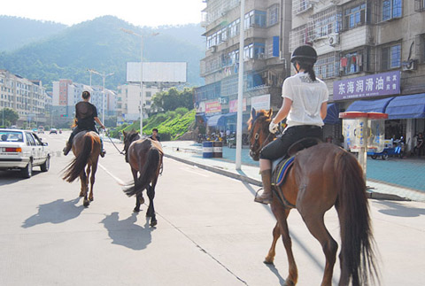 連日來(lái)的傍晚時(shí)分,只要天氣晴好,(浙江)諸暨最繁華的街區(qū)就會(huì)出現(xiàn)這樣一副場(chǎng)景:兩三名時(shí)尚男女,身穿騎師服裝,騎著高頭大馬,旁若無(wú)人地在車流中穿行。途經(jīng)之處,總引得好奇市民拿起手機(jī)、相機(jī)一通抓拍。