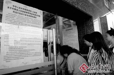 奧運(yùn)會即將召開之際,昆明發(fā)生的公交車爆炸案,繃緊了公共交通工具的安全神經(jīng)。昨日,民警和保安在昆明火車站四處張貼了一份通告,按照所張貼的鐵道部和公安部聯(lián)合發(fā)出的最新通告,從現(xiàn)在至9月20日,對旅客乘坐火車攜帶物品和通過鐵路托運(yùn)行包必須實(shí)行安全檢查,菜刀、大型水果刀、剪刀、斧子、錘子等利器、鈍器一律放入行李中托運(yùn)。通告指出,對拒絕接受安全檢查或堅(jiān)持?jǐn)y帶違禁物品的旅客,鐵路部門可禁止其進(jìn)站乘車。