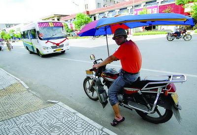 7月3日,湖南常寧市,一名摩的司機正在休息,不遠處是免費公交車