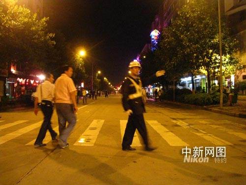 今晚八時許,在昆明城西交林路發(fā)現一可疑黑色箱包,昆明出動大批警力將現場封鎖。圖為交林路與人民西路路口交警在“斷交”。 王林 攝