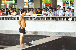 昨天下午3點(diǎn)10分左右,一年輕男子赤裸著上身,下身也僅穿了條黑色短褲,光腳爬上火車站站內(nèi)廣場(chǎng),地鐵通道上的一根橫梁柱上,其腳下就是近10米高的地下通道,據(jù)圍觀市民介紹,該男子手叉腰部?jī)蓚?cè),既不說(shuō)話,也不挪動(dòng)半步。旅客見(jiàn)狀紛紛向該男子叫喊,希望他想開一些,可該男子似乎“無(wú)動(dòng)于衷”。