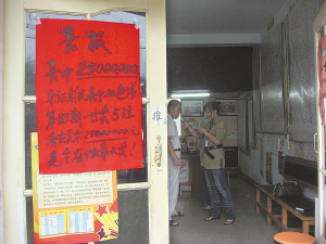 據(jù) “彩票大贏家”投注站店主介紹,這個(gè)站在兩年前,曾經(jīng)開出過91.5萬的大獎(jiǎng),“這回刷新紀(jì)錄了!庇浾咦⒁獾,投注站的招牌背景,印了很多“2元=500萬”的字樣,“這下成真的了!”