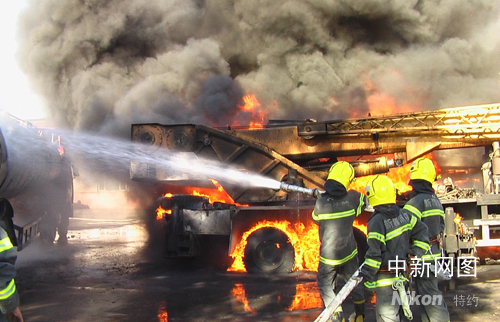一中隊于09時34分到達火災(zāi)現(xiàn)場后經(jīng)觀察及詢問知情人,停車場院內(nèi)1輛載重28.58噸凝淅油油罐車和3輛吊車著火,鄰近的另外3輛吊車、20余輛貨車及汽車修理鋪受到威脅,油罐隨時發(fā)生爆炸,如不及時控制火勢,造成的后果將不堪設(shè)想。