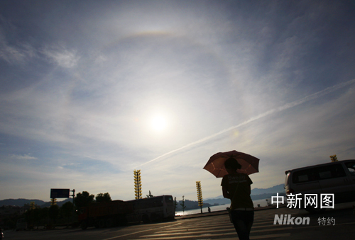 中新網(wǎng)杭州8月6日電(見習(xí)記者 張潔 通訊員 程賢高)“月暈三更雨,日暈午時風(fēng)”。2008年8月6日上午7時左右,在杭州市淳安縣千島湖畔,剛升上山際兩丈許的太陽周圍出現(xiàn)了較為明顯的彩色暈環(huán)。在氣象上,這種暈環(huán)就是“日暈”,是不太多見的大氣光學(xué)現(xiàn)象,預(yù)示著天氣將出一定變化。(完)