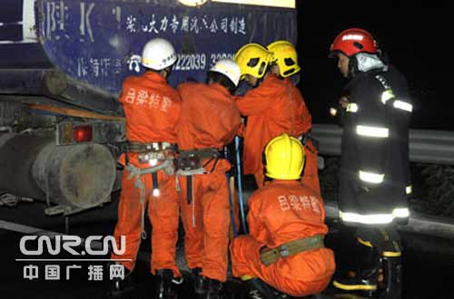 接到報(bào)警后,呂梁市消防支隊(duì)119指揮中心迅速調(diào)集6輛消防車(chē),27名指戰(zhàn)員火速趕赴現(xiàn)場(chǎng)。經(jīng)詢(xún)問(wèn)現(xiàn)場(chǎng)的知情人和對(duì)災(zāi)害現(xiàn)場(chǎng)的初步偵察,得知一輛車(chē)牌號(hào)為陜K1910裝有24噸汽油的油槽車(chē)從陜西榆林運(yùn)往山西呂梁市,在距離石高速口500米的下坡路段時(shí)與一輛大貨車(chē)發(fā)生追尾事故,車(chē)牌號(hào)為陜K1910油罐車(chē)卸油口被撞裂開(kāi)一條大口,大量汽油呈噴射狀向外漏,沿高速路流淌距離長(zhǎng)達(dá)1公里左右,此時(shí)只要有一點(diǎn)火星,就可能發(fā)生爆炸事故,高速路旁邊的居民區(qū)將夷為平地,情況萬(wàn)分危機(jī)。