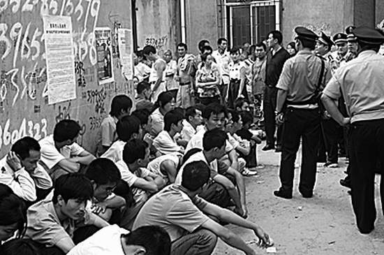 記者隨同民警清查時(shí)發(fā)現(xiàn),樓房內(nèi)幾乎每個(gè)房間都是房門緊鎖,任由外面的民警怎么敲門,里面的人就是不開門。在二樓的一個(gè)房間外,民警敲門足足幾分鐘始終無人開門,于是將門鎖撬開進(jìn)入,發(fā)現(xiàn)簡陋的客廳里,靠四周墻壁坐著20多個(gè)年輕人,男的占大多數(shù)。