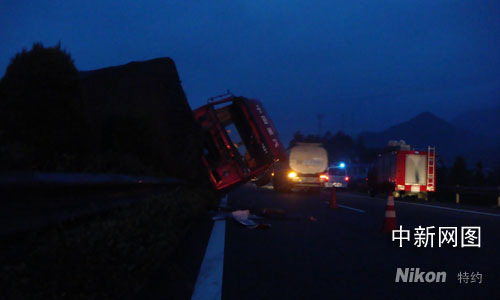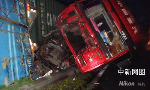 據(jù)了解,第一次追尾的兩輛集裝廂卡車已經(jīng)被分離開,工作人員正在拖離事故車輛。在后方不到兩公里處被堵車輛長隊當中,一輛大型集裝廂卡車(為浙BA9429)的車頭已經(jīng)完全搭在了中間的隔離帶上,駕駛室已經(jīng)竄到了旁邊的另一方向車道上。前面是一輛中型廂式貨車(浙JA6312),已經(jīng)被大卡車撞翻,橫在路中央,在兩輛車右側(cè)和前側(cè),先后有四輛車都發(fā)生追尾和刮擦,受傷的(浙JA6312)司機已經(jīng)被救出送往醫(yī)院。