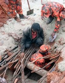 求救的男子撲通一聲跪倒在地,淚水瞬間打濕了面頰;協(xié)助救援的村民們也都紛紛捂著臉,退向外圍;文偉、薛紅兵、鐘銀和劉小威低下頭,悄悄抹去眼淚,“干了這么多年救援,就從沒(méi)見(jiàn)過(guò)這樣的場(chǎng)面。”為了不傷害母女倆的遺體,4個(gè)人把鋤頭、鐵鍬等全部扔了出去,改為徒手挖掘,“每一秒鐘,我都有一種想跪倒的感覺(jué),我們所面對(duì)的,已不是她們的遺體,而是偉大的母愛(ài)!
