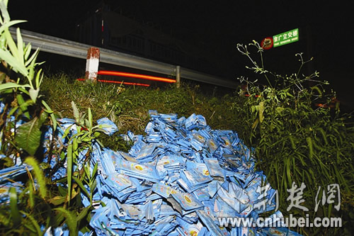 昨晚9時許,記者趕到現(xiàn)場看到,京廣立交橋離孝感主城區(qū)約1公里左右,是107國道與京廣線的交會處,奶粉袋位于107國道橋頭的雜草叢中,每5個空袋用橡皮筋捆為一扎。記者隨手翻開了兩扎,發(fā)現(xiàn)奶粉袋上灰塵不多,袋口均有撕開的痕跡,上面標(biāo)注的生產(chǎn)日期從2006年3月到9月不等,保質(zhì)期為18個月。